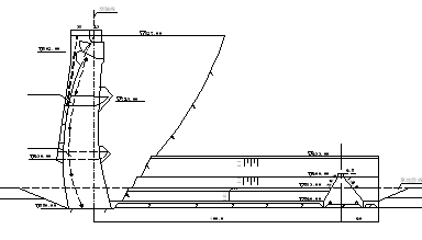 水垫塘设置时要与拱坝相邻,水垫塘从底部到二道坝的长度为200.2m,其断面形式设计时采取的是复式梯形断面,底部板面选择平地设计,其高度大约为 5m,底板顶面高度要依照建基要求来决定,最后考虑地理条件、大坝的所处地形条件以及抗力物体稳定的基本条件,从下游到上游方向水垫塘的底部直径是50-76之间。水垫塘两岸,每相隔23m就会设置一个马道,马道的大小是6m左右,并且其所用的钢筋混凝土砌护高度是1987.3m。